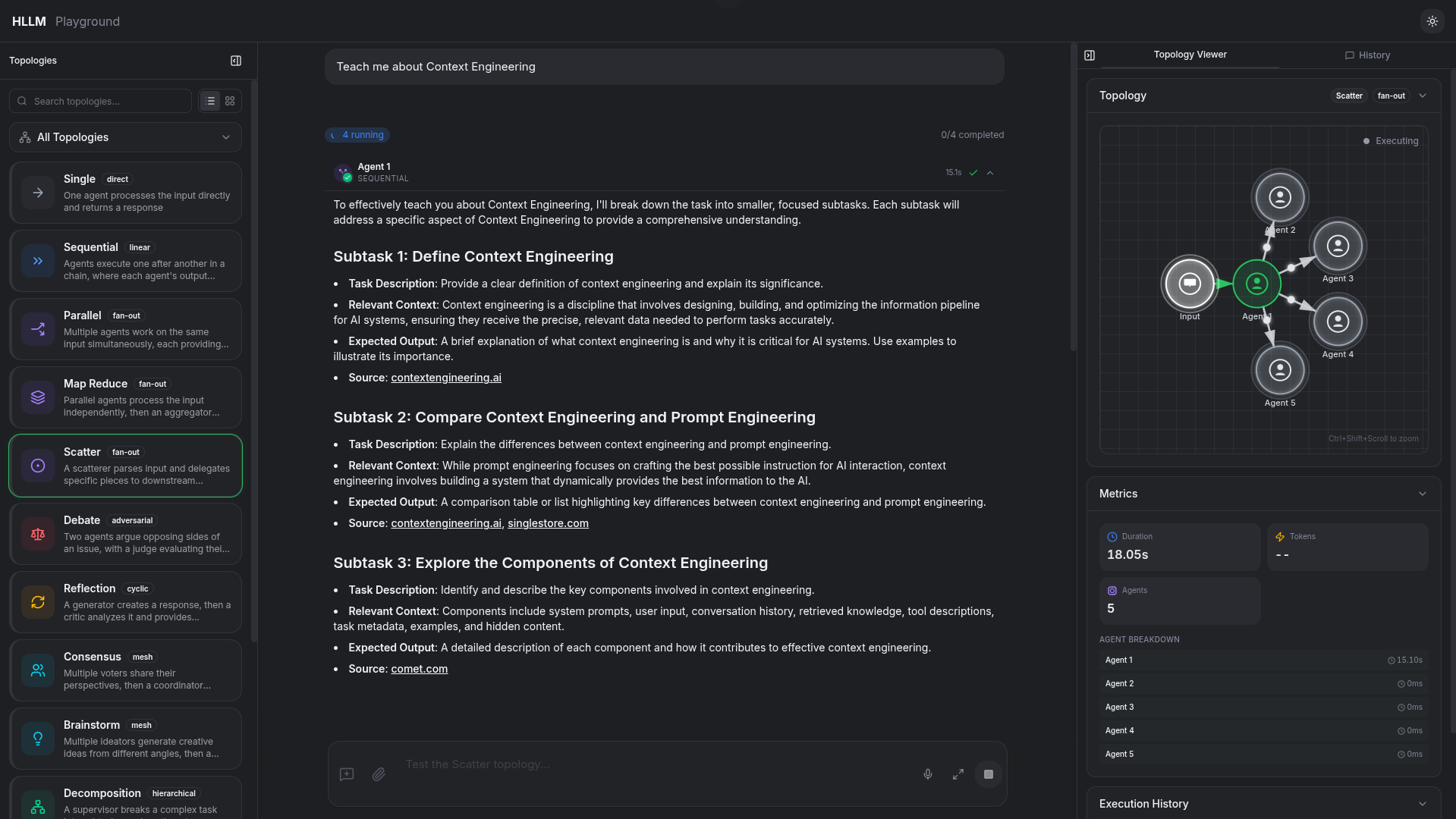 The Playground is where your topology turns into a running system. Instead of guessing how agents behave inside a black box, you can watch execution unfold step by step, seeing which agent acts, what data it receives, and how decisions propagate through the system.Proven architectures for agent collaboration